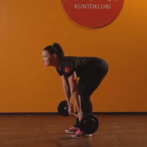 Ota kahvakuula molemmin käsin ja seiso hyvässä ryhdissä. Aloita liike koukistamalla hieman jalkoja ja viemällä kahvakuula jalkojen väliin, suorista jalat ja lantion kulma ja anna kuulan nousta ojennuksen voimasta noin silmien korkeudelle. Muutaman heilautuksen jälkeen löydät liikkeeseen rytmin ja huomaat miten takareidet työskentelevät, kun lasket kuulaa alaspäin.