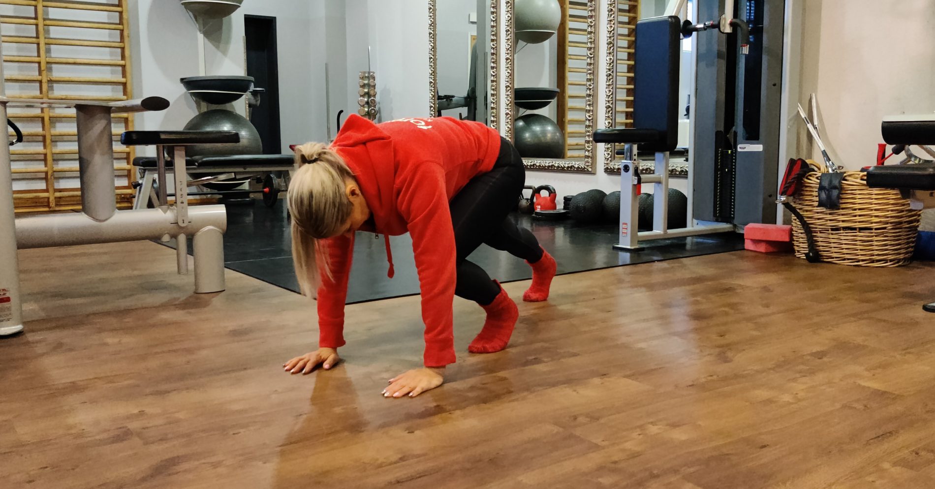 Ota punnerrus asento. Lähde vetämään jalkoja rinnan alle vuorotellen. Pidä hyvä lapatuki koko liikkeen ajan. Voit tehdä liikkeen hitaasti nautiskellen tai nopeasti hyvällä sykkeellä.